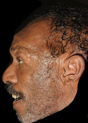 Blue jeans, tan Mossimo shoes (size 11), socks, belt and a teal medical scrub shirt. The decedent had black and gray curly hair, mustache and beard and was missing several teeth. The decedent was found unresponsive at a Metro bus stop near 6800 Chetwood Drive in Houston, Harris County, Texas.