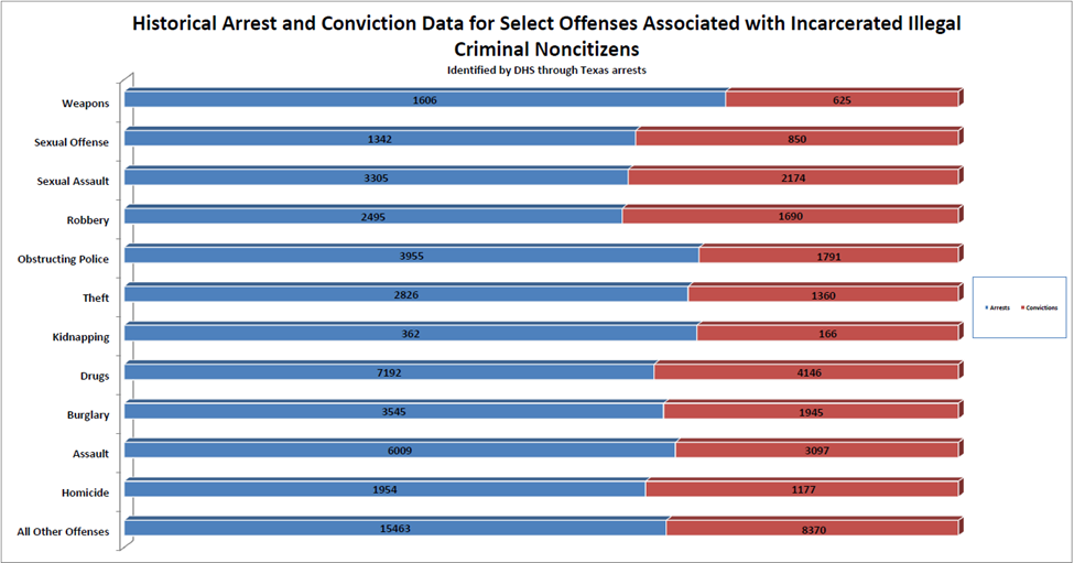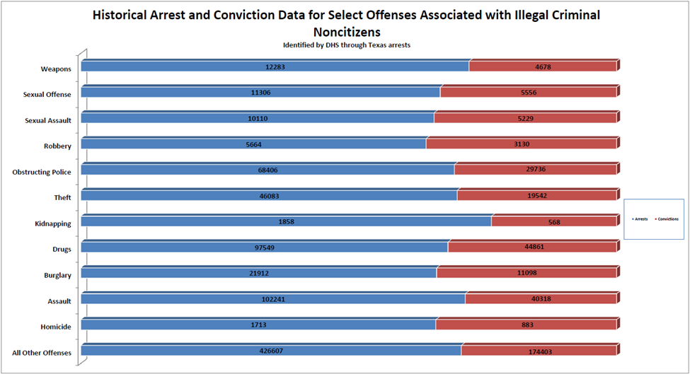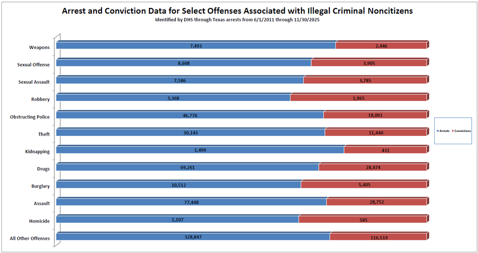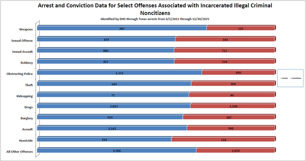 Between June 1, 2011, and November 30, 2025, these 334,000 illegal noncitizens were charged with more than 592,000 criminal offenses which included arrests for 1,107 homicide charges; 77,448 assault charges; 10,512 burglary charges; 69,261 drug charges; 1,499 kidnapping charges; 30,143 theft charges; 46,776 obstructing police charges; 3,368 robbery charges; 7,586 sexual assault charges; 8,608 sexual offense charges; and 7,493 weapon charges. DPS criminal history records reflect those criminal charges have thus far resulted in over 221,000 convictions including 585 homicide convictions; 28,752 assault convictions; 5,405 burglary convictions; 28,474 drug convictions; 431 kidnapping convictions; 11,440 theft convictions; 18,061 obstructing police convictions; 1,965 robbery convictions; 3,785 sexual assault convictions; 3,905 sexual offense convictions; and 2,446 weapon convictions.