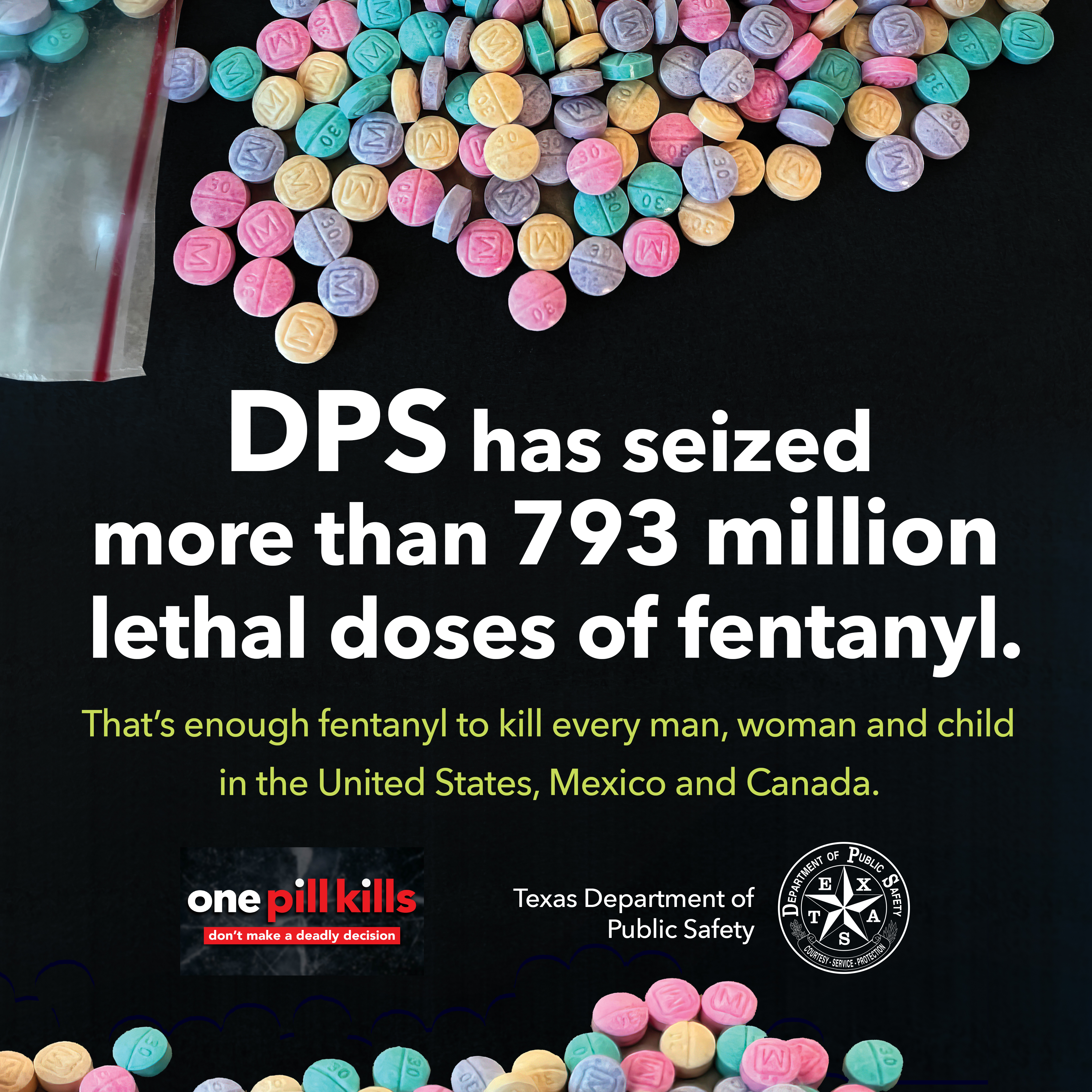To combat the rise in fentanyl across Texas, DPS continues to combat the smuggling of this deadly drug into our state, particularly as part of Operation Lone Star. Since Operation Lone Star began in March 2021, Texas law enforcement has seized more than 793 million* lethal doses of fentanyl across the state. This is enough fentanyl to kill every man, woman and child in the United States, Mexico and Canada.