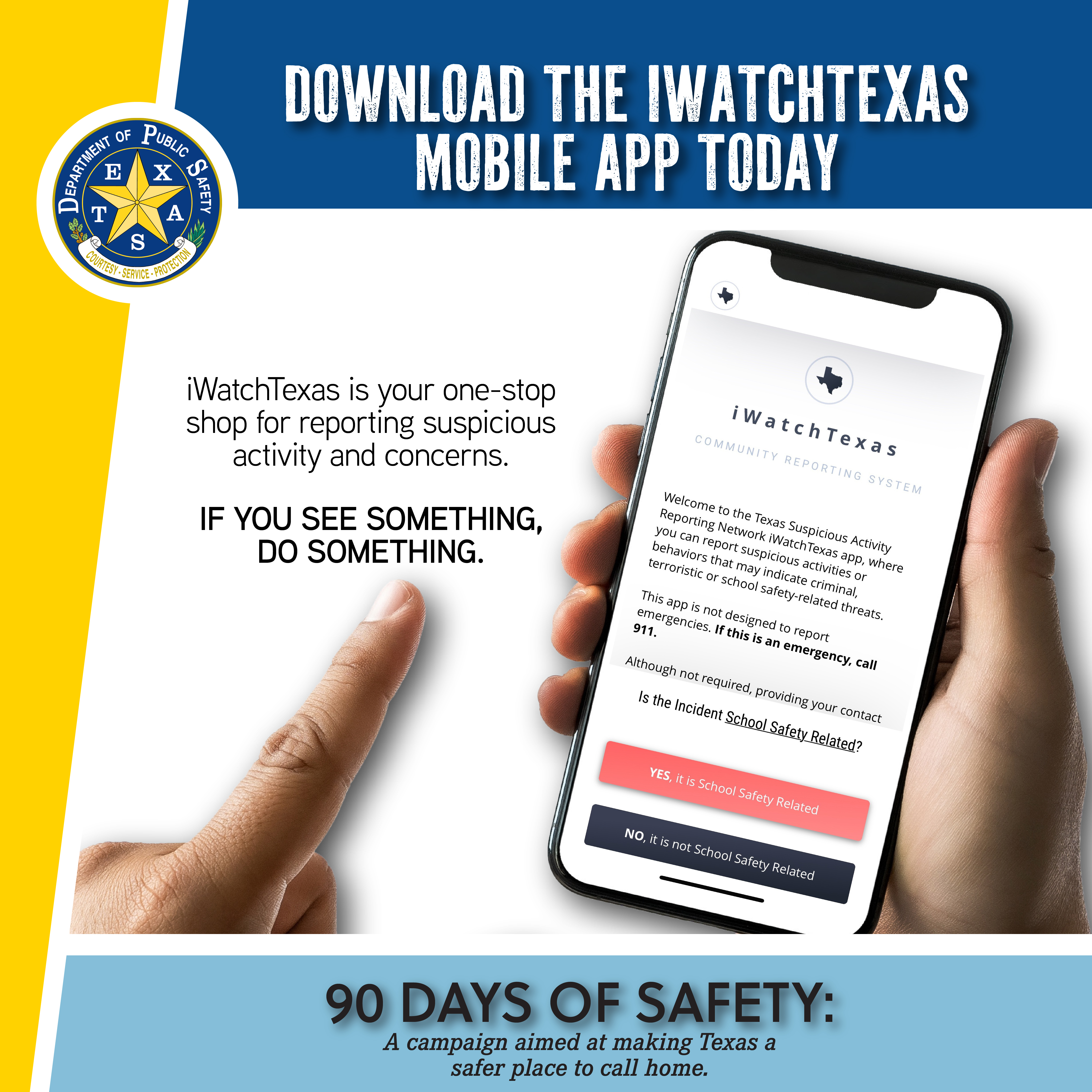 - iWatchTexas: Download the iWatchTexas app on your mobile device. Then, be prepared to report suspicious activity when you see it in schools and your community. A report takes less than 5 minutes to submit and can stop a variety of bad actors and attacks. We KNOW it saves lives.